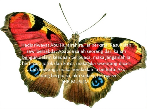 Hadis riwayat Abu Hurairah ra., ia berkata: Rasulullah saw. bersabda: Apabila salah seorang dari kalian bangun dalam keadaan berpuasa, maka janganlah ia berbicara jorok dan kotor, maka jika seseorang dicaci atau diperangi, maka hendaklah ia berkata: Aku sedang berpuasa, aku sedang berpuasa. ( HR.Muslim No:1941 )